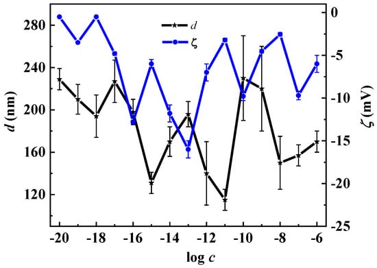 Studying the tryptophan solutions by the electrophoretic light-scattering (ELS) method, we found that the average ζ-potential of micelle-like particles is −13.0 ± −2.0 mV, domains −8.0 ± −1.5 mV, and for nanoassociates these values change non-monotonically from −1.0 mV to −16.0 mV (Figure 2). The negative ζ-potential of micelle-like particles and domains is most likely due to the fact that they are formed mainly by L-Trp zwitterions. Nanoassociates’ common characteristic feature is a negative sign of their ζ-potential, which is independent of the molecular structure or the charge of the BACs ions. The mechanism underlying this phenomenon has not yet been discovered, but according to the works [,], it may be related to the properties of the ordered water structures that form a nanoassociate. Figure 2 shows the non-monotonic-correlated concentration dependencies of the nanoassociates’ size (d) and ζ-potential. A consistent increase of both parameters is observed at concentrations of 1 × 10−17, 1 × 10−13 and 1 × 10−10 mol/L, while a correlated decrease is seen at concentrations of 1 × 10−18, 1 × 10−15, and 1 × 10−11 mol/L.