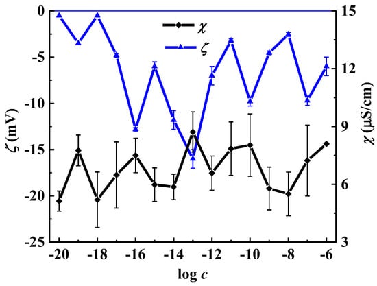 It is known that the formation and rearrangement of the dispersed phase initiates the emergence of non-monotonic concentration dependencies of systems’ physicochemical properties []. Figure 3 and Figure S3 (Supplementary Materials) show non-monotonic concentration dependencies of the ζ-potential (Figure 3) and d (Figure S3) of nanoassociates and specific conductivity (χ) values of the L-Trp systems. It is clearly seen that not only the nanoassociates’ parameters but also the systems’ χ reach their extreme values at the abovementioned concentrations or in their vicinity.
