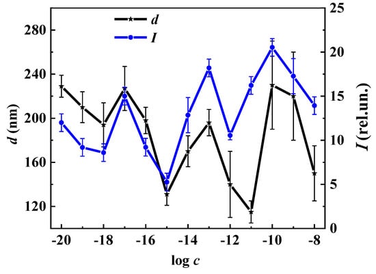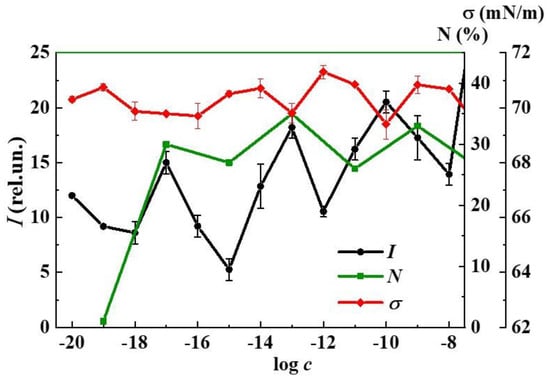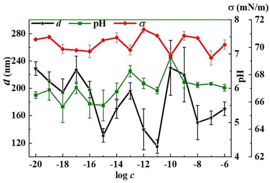 Figure 4 shows non-monotonic concentration dependencies of nanoassociates’ d and the systems’ pH and surface tension (σ) values. Both this figure and Figure 3 clearly demonstrate the relationship of the dependencies of nanoassociates’ parameters and systems’ properties, which change in phase (d and pH) or in antiphase (d and σ, ζ-potential and χ) with extremes in the vicinity of critical concentrations 1 × 10−17, 1 × 10−13, and 1 × 10−10 mol/L.