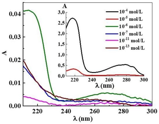 UV absorption (A) spectra of L-Trp systems in the range from 1 × 10−20 mol/L to 1 × 10–4 mol/L were obtained after deducting the baseline of the water used to prepare the solutions (Figure 5). In the vicinity of the threshold concentration of 1 × 10−6 mol/L, the spectrum shape of the system is close to that of the L-Trp systems at a higher concentration range of 1 × 10−5–1 × 10−4 mol/L [,], with maxima at 218 nm and 270–280 nm (Figure 5, inset). Starting from the threshold concentration of 1 × 10−7 mol/L and lower, the spectra have a different appearance characteristic of the previously described BACs systems in similar low concentration ranges where nanoassociates are formed, with a weakly pronounced shoulder at 225 nm and a band in the 250–270 nm interval [,,,,].