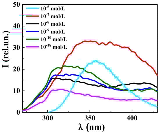 Figure 6 shows the fluorescence spectra (λex 225 nm) of L-Trp systems with concentrations of 1 × 10−6, 1 × 10−7, 1 × 10−8, 1 × 10−9, 1 × 10−10, and 1 × 10−18 mol/L obtained in the “medium voltage” mode (1 × 10−6 mol/L) and “high voltage” mode (1 × 10−7 mol/L and below). Starting from the threshold concentration of 1 × 10−7 mol/L, the spectrum shape becomes different from the spectra of L-Trp systems at concentrations of 1 × 10−6–1 × 10−4 mol/L (Figure S5 and Figure 6), the latter being characterized by an almost symmetrical band in the 300–400 nm range with a maximum at 350–360 nm analogous to [,]. The system’s spectrum at 1 × 10−7 mol/L is a wider band at a 290–440 nm range, which has a plateau with a maximum at 340–400 nm. Apparently, this is a complex band made up from an L-Trp band and two bands characteristic of the more diluted BACs systems in which nanoassociates are formed [,,,].