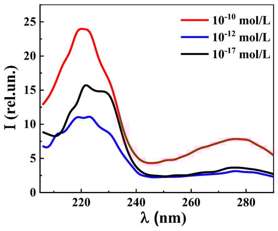 Figure 7 shows the excitation spectra (λem 340 nm) of the L-Trp systems at concentrations of 1 × 10−10, 1 × 10−12, and 1 × 10−17 mol/L. The spectra have the form of two weakly overlapping broad bands in the short-wave (215–240 nm) and long-wave regions (260–290 nm). It is apparent that the short-wave band with a maximum at 220 nm is approximately three times more intense than the long-wave band with a maximum at 275 nm. Excitation and absorption spectra (Figure 5) are close, which is typical for fluorescent systems [,]. The excitation spectra of the L-Trp systems are similar to those of the previously studied diluted BACs systems [,,,].