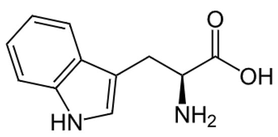 L-tryptophan (L-Trp) is a proteinogenic-essential heterocyclic aromatic α-amino acid (Scheme 1) that constitutes the proteins of all known animal organisms and plant bodies []. One of the most interesting spectral properties of L-Trp is that it has pronounced fluorescence, which is mostly explained by a π-system of the indole fragment of the L-Trp molecule [,].