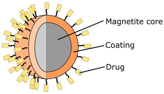 Therapeutics can then be directed to the desired location through a magnetic field []. The magnetic nanoparticle–drug complex is delivered by manipulating an external magnetic field using electromagnetic coils [] to various types of permanent magnets [] (Figure 2). In addition, nanoparticles can be functionalized, e.g., with folic-acid groups that interact with receptors specific for some tumors to increase specificity []. The potential of these delivery systems for anticancer drugs has been shown in several studies. For example, magnetite nanoparticles with attached carboplatin particles showed a high rate of inhibition of ovarian tumors without significant toxicity to healthy organs []. Similarly, promising research has been carried out on a multifunctional nanoplatform delivering cisplatin to cancer cells []. The platform consisted of biodegradable PLGA surface-functionalized by chitosan and polyvinyl alcohol with additional SPIONs. Tests showed increased release time of cisplatin to more than 10 days and confirmed the possibility of using nanoparticles also as an imaging agent. Another study has shown that drug-coated polymer nanospheres and nanocapsules enhance intracellular anticancer effects []. The method of drug delivery into the body was also developed using multilayer microcapsules composed of poly (allylamine) and poly (sodium 4-styrene sulfonate). This method has been tested in in vitro and in vivo conditions [].