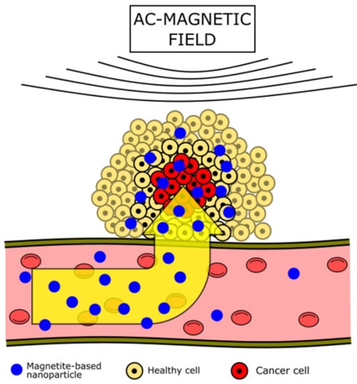 One of the proposed alternative approaches in cancer treatment is magnetic hyperthermia []. Hyperthermia is already used to support the treatment of many cancers, e.g., head and neck, breast, cervical, sarcomas, and melanomas []. Although selective hyperthermia is not expected to be a standalone method, it could put selective pressure on cancer cells, increasing the therapeutic effect of primary cancer treatment. In the method, thermal energy is generated when magnetic nanoparticles are influenced by an alternating magnetic field []. Limiting the magnetic field gradient to a pathogenic site only allows increasing body temperature in the desired region of the body selectively.
