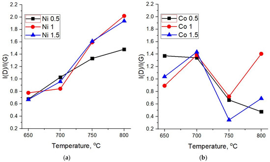 Figure 8a for CNTs synthesized on the Ni catalyst characterize an increase in the long-range order of the structure with an increase in the temperature. The lower the value of I(G)/I(2D), the higher the long range order. It can be seen that in the case of the Co catalyst, the long-range order remains high at all concentrations and temperatures, thus indicating a high quality of the formed CNTs (