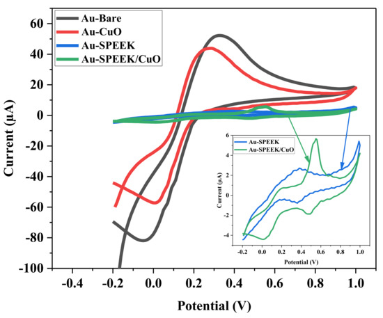 Fayemi, O.E.; Pooe, O.G.; Adesanya, F.A.; Ejidike, I.P. Spectroscopy and Cyclic Voltammetry Properties of SPEEK/CuO Nanocomposite at Screen-Printed Gold Electrodes. Nanomaterials 2022, 12, 1825. https://doi.org/10.3390/nano12111825