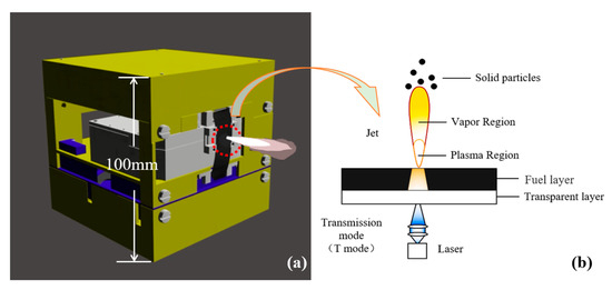 (a) The three-dimensional structure of the cube laser ablation micro-thruster; (b) The laser ablation principle of transmission mode. Reprinted with permission from [19]. Copyright 2022, IOP Publishing.