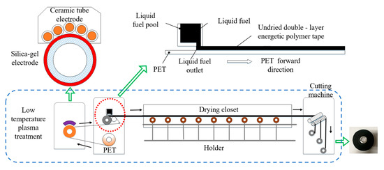 The production system and process of the double-layer tape are shown in Figure 2. The system was mainly composed of the transmission mechanism, plasma treatment equipment (PG-6000F, produced by Nanjing Suman Plasma Technology Company, Nanjing, China), double-layer tape coating equipment, drying box, and double-layer tape cutting equipment. By adjusting the distance between the blade and the PET, different thicknesses of tape were made. The PET surface was treated with low-temperature plasma in air to improve the adhesion between the PET and GAP. Low-temperature plasma was generated by DBD discharge. Its discharge power range was 100–3000 W. Low-temperature plasma with a power of 1500 W was used to treat the surface of the PET in this paper. The electrode material was corundum ceramic.