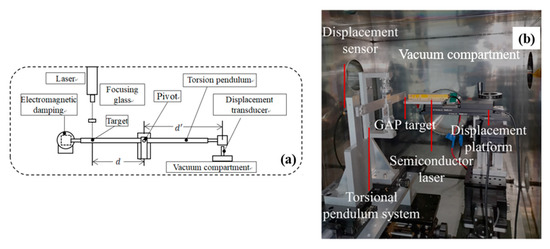 The experimental system is shown in Figure 3a,b [19]. The experimental system includes a semiconductor laser, vacuum chamber, torsion pendulum, displacement sensor, electromagnetic damper, displacement stage controller, and electromagnetic damping controller [31,32]. The vacuum degree of the vacuum chamber can reach 10−5 Pa.