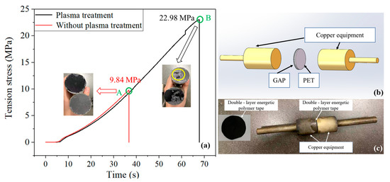 The double-layer tape was clamped to the middle of the copper tool with high-strength glue, and the adhesion between the PET and GAP pre- and post-plasma treatment was tested by the tensile testing machine. The results are shown in Figure 4. It can be seen from the figure that the tensile stress without the plasma treatment was about 9.84 MPa, as indicated at point A in the figure. After the plasma treatment, the tensile stress was about 22.98 MPa, as indicated by point B in the figure. The tensile stress was increased by about 133.5%. By comparing the surface of the joint after the tooling was pulled apart, it can be found that the GAP and PET were separated thoroughly without the plasma treatment, leaving no residual components. However, after the plasma treatment, the separation of the GAP and PET were not complete enough. There was still a small amount of residue on the surface of the PET. This showed that the adhesion of the PET surface was obviously enhanced after the plasma treatment [33].