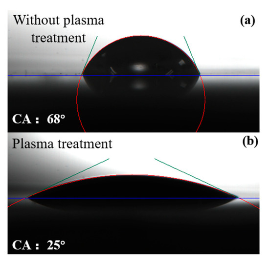 The contact angle of the liquid GAP and PET was measured by the contact angle measuring instrument. The measurement results are shown in Figure 5. Figure 5a shows the contact angle between the PET and liquid GAP without the plasma treatment, which was about 68°. Figure 5b shows the contact angle of the plasma-treated PET and liquid GAP, which was about 25°. It can be found that the contact angle between the PET and liquid GAP decreased significantly after the plasma treatment. This indicated that the wettability of the PET surface had been significantly improved after the plasma treatment [34,35,36].