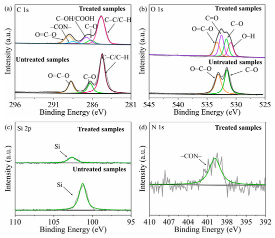 XPS analysis map, including different elements’ bonds pre- and post-plasma treatment: (a) C 1s, (b) O 1s, (c) Si 2p, (d) N 1s.