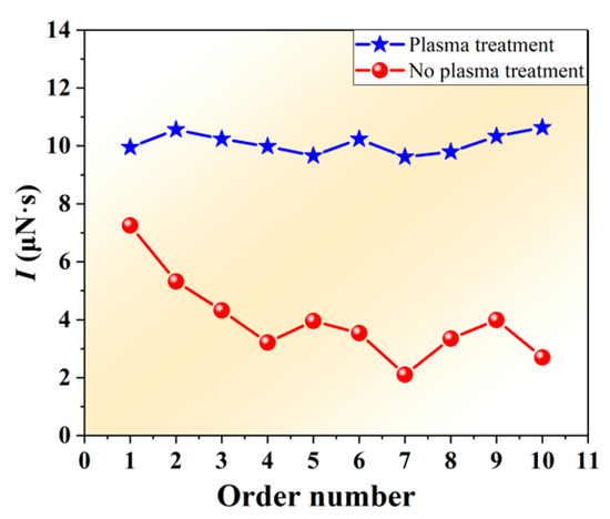When the laser pulse width was 200 μs and the ablation pits interval was about 800 μm, the single-pulse impulse (I) was continuously measured for 10 times. The results are shown in Figure 9. It can be seen from the figure that the I of the tape with the plasma treatment was more stable and less volatile. The I of the tape without the plasma treatment decreased obviously and was very unstable. The reason was that the tape without the plasma treatment had poor adhesion, and the GAP and PET were separated during laser ablation. There were two reasons for the decrease of I caused by separation of the GAP and PET. One was that the separation of the GAP and PET could cause laser defocus, which greatly reduced the laser power density and the ablation efficiency. Another reason was that, after separation, there was a lack of bottom support during plume spraying, so that the force produced by the laser ablation GAP cannot be fully transferred to the PET. The stability of I was the premise to ensure the thrust stability of the laser ablation micro-thruster [38]. In continuous ablation, the separation phenomenon would not only reduce the average thrust, but also cause thrust instability.