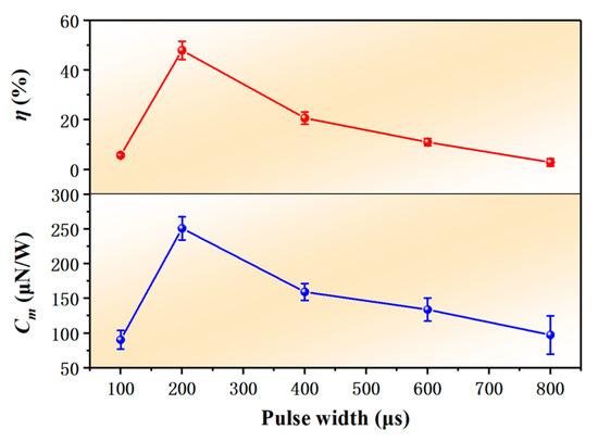 Figure 11 shows the curves of Cm and η with laser pulse width. As can be seen from Figure 11, both Cm and η increase first and then decrease. When the pulse width was 200 μs, the maximum Cm was 250.82 μN/W, and the maximum η was 48.01%. At 800 μs pulse width, Cm and η were 97.38 μN/W and 2.88%, respectively. When the pulse width was 800 μs, Cm and η were 38.82% and 6.0% of 200 μs pulse width, respectively.