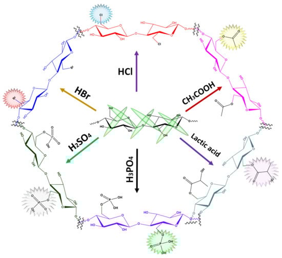 - Habibi, Y. Key Advances in the Chemical Modification of Nanocelluloses. Chem. Soc. Rev. 2014, 43, 1519–1542. [Google Scholar] [CrossRef]
