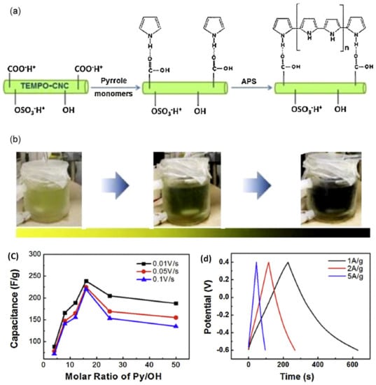 (a,b) In situ polymerization synthesis of CNC/PPy, (c) Effect of PPy on the capacitance of CNC/PPy, (d) Charge and discharge test of CNC/PPy at 1 Ag−1, 2 Ag−1 and 5 Ag−1 (charge current). Adapted with permission from []. Copyright 2014 Elsevier.