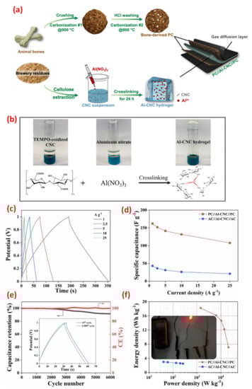 (a) The preparation of PC//Al−CNC//PC as a flexible supercapacitor, (b) The preparation of TEMPO mediated Al−CNC hydrogel, (c–f) The electrochemical properties, such as the GCD curve, specific capacitance, stability analysis and Ragone plot, of the PC//Al−CNC//PC electrode. Adapted with permission from []. Copyright 2022 Elsevier.