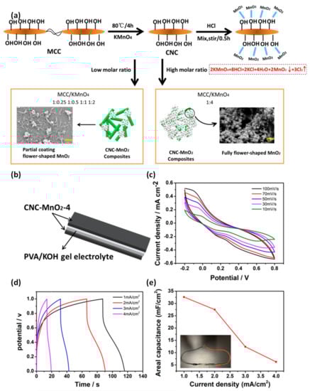 (a,b) Schematic synthetic route of the solid-state supercapacitor using the CNC−MnO2 electrode. (c–e) CV curves, GCD curves and the areal capacitance of CNC−MnO2. Adapted with permission from []. Copyright American Chemical Society (ACS).