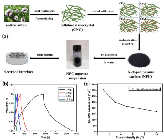 (a) N−doped cellulose nanocrystals (N−CNCs) are prepared from cotton and urea. (b,c) Electrochemical GCD curve and specific capacitance of N−CNCs under different current densities. Adapted with permission from []. Copyright 2020 Elsevier.