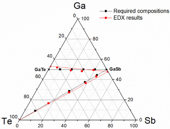 Ternary diagram with compositions of (co-)deposited thin films: as required (black marks), as determined by SEM-EDX (red marks). Corresponding tie-lines connecting uttermost compositions are included as follows: black tie-lines for target nominal compositions, red tie-lines for single source deposited thin films compositions as revealed by SEM-EDX (power of 15 W for GaSb or GaTe and 10 W for Te).