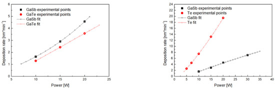 Because different shapes of deposition rate vs. power dependency were previously reported [23,24,25,26,27,28,29], linear or exponential functions based on currently known trial depositions values were applied in order to obtain precise fits as described in the Results Section. As shown in Figure S2, the originally proposed exponential function for GaSb within the 10–15–20 W power range was proven to be inappropriate when 30 W point, which was necessary to be added for GaSb-Te co-depositions, was considered.