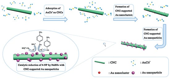 CNCs were used as a support to synthesize gold nanoparticles (Au NPs) by heating the aqueous mixture of polyethylene glycol, CNCs, and HAuCl4 at 80 °C for 1 h. In this way, extreme conditions and toxic chemicals as well as a complicated procedure were avoided (Figure 3). The prepared CNC-supported Au NPs demonstrated high catalytic activity for the reduction of 4-nitrophenol using sodium borohydride. The maximum turnover frequency and the apparent rate constant reached 641 h−1 and 1.47 × 10−2 s−1, respectively. Due to the large concentration of highly dispersed Au NPs (average size 2–15 nm) that was deposited onto the CNC surface, a high catalytic performance was observed. The reported procedure proved to be environmentally-friendly, low-cost, and simple and has a large potential in medical and industrial applications [84].