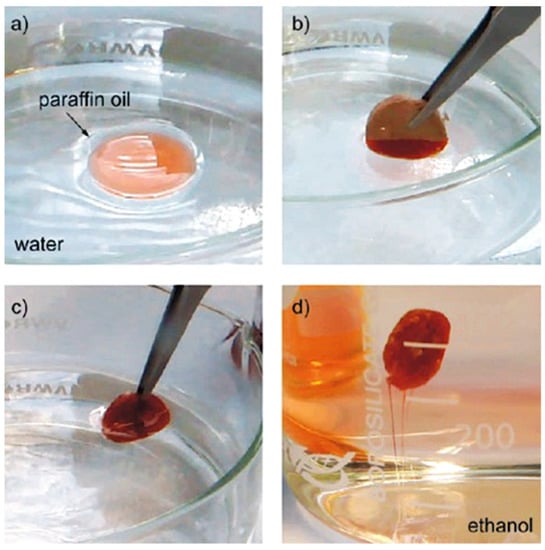 Cellulosic aerogels have been modified with TiO2 nanoparticles using a chemical vapor deposition process, introducing oleophobic functionality in such systems. It was demonstrated that functionalization of the native cellulose nanofibrils of the aerogel with an oleophilic and hydrophobic titania coating produced a water floating and selectively oil-absorbing material. These surface modified aerogels enabled the removal of organic contaminants from the water surface due to the low density combined with the capability to absorb large amounts of nonpolar liquids and oils (Figure 5), and moreover, they were recyclable and reusable after washing or alternatively, they could be incinerated together with the absorbed liquid [159].