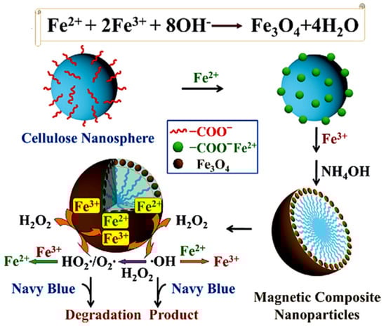 The formation and catalytic mechanism of MNPs. Magnetic iron oxides were anchored on the cellulose nanospheres by using a co-precipitation process; the rapid removal of textile dye Navy blue was achieved in the Fenton-like system. Reprinted from [163]. Copyright 2015, with permission from Elsevier Ltd.