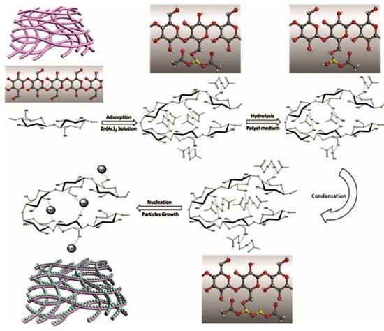 The schematic illustration of the formation of the ZnO nanoparticles impregnated into the BC [167]. Copyright 2013, with permission from Elsevier Ltd.