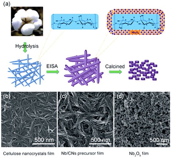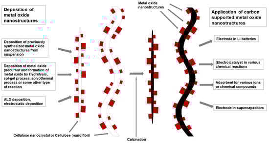 The successful design and formation of inorganic nanostructures require effective and convenient methods for their fabrication. In this context, the synthesis of nanomaterials from biopolymers as the templates is a promising approach, which enables the design of complex hierarchical material systems or nanodevices. Celluloses and nanocelluloses are particularly attractive as bio-templating materials because of their highly interactive surface due to a large number of reactive hydroxyl groups that can efficiently nucleate inorganic phases around the rod-like cellulose structures. Cellulose fibers and cellulose nanostructures are supposed to direct the formation, growth, and patterning of inorganic materials to produce various types of nanostructures (nanoparticles, nanowires, or nanotubes) with unique combinations of optical, electrical, and catalytic properties [13]. High open porosity, large surface area, and high mechanical strength make any form of cellulose almost an ideal candidate for the supporting medium in the synthesis of nanostructures.
