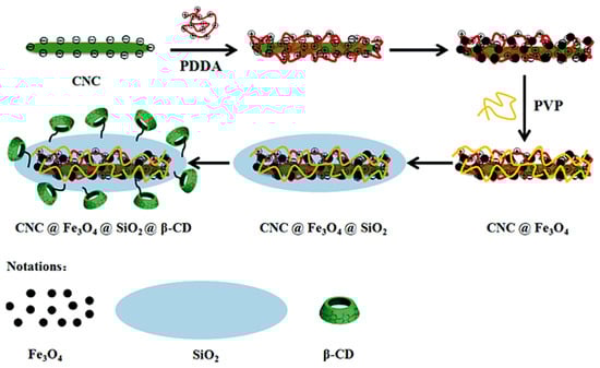 - Chen, L.; Berry, R.M.; Tam, K.C. Synthesis of β-Cyclodextrin-Modified Cellulose Nanocrystals (CNCs)@Fe3O4@SiO2 Superparamagnetic Nanorods. ACS Sustain. Chem. Eng. 2014, 2, 951–958. [Google Scholar] [CrossRef]