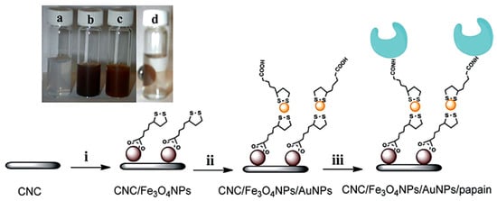 - Mahmoud, K.A.; Lam, E.; Hrapovic, S.; Luong, J.H.T. Preparation of Well-Dispersed Gold/Magnetite Nanoparticles Embedded on Cellulose Nanocrystals for Efficient Immobilization of Papain Enzyme. ACS Appl. Mater. Interfaces 2013, 5, 4978–4985. [Google Scholar] [CrossRef]