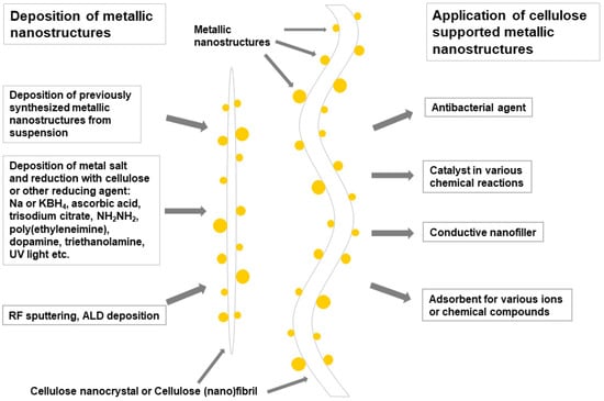 Various procedures of the formation of metallic nanostructures on the surface of cellulose have been reported. Authors have frequently used nanocellulose as a metallic nanoparticle support, but other forms of cellulose, even native cellulose fibers, are also useful for this purpose. With respect to the type of metal, mostly noble and particles of some transition metals are deposited on the cellulose surface.
