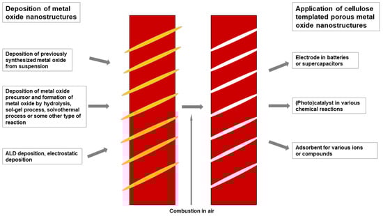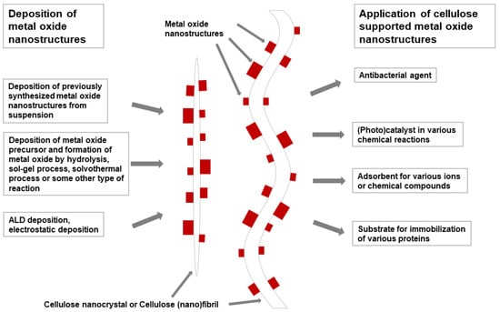 Cellulose structures were used as supports and templates for the formation of various metal oxide nanostructures. In contrast to metallic nanostructures that are mainly limited to noble or semi-noble metals, practically any type of metal oxide can be deposited on the cellulose surface with TiO2, Fe3O4, and ZnO being the most abundant. For this purpose, various cellulose types have been applied, spanning from natural cellulose fibers to cellulose nanocrystals in the original or chemically modified form.