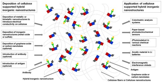 Recent progress reported in the scientific literature suggests that a synergetic use of the cellulose (nano)fibers together with suitable functionalization pathways will constitute a breakthrough in the formation of templated metallic- and metal oxide hierarchical nanostructures in the near future. Therefore, this review focuses on the utilization of cellulose and nanocellulose materials as templates or building blocks for the formation of nanomaterials and hierarchical functional materials. It provides a review of the applications of any form of cellulose as a template, supporting medium, or growing vector for the formation of inorganic nanostructures. With respect to the presence of cellulose in the final product, these applications can be divided into two groups: cellulose-supported structures and pure inorganic cellulose-templated structures. The first group comprises the publications reporting on the nanostructures where cellulose remains a constitutive component of the final nanocomposite structure, whereas the second group constitutes the publications dealing with the formation of metallic- or metal oxide nanostructures followed by subsequent elimination of the cellulose by calcination, resulting in pure inorganic structures. A special subgroup represents the inorganic nanostructures supported by carbon fibers formed from cellulose fibers by calcination in an inert atmosphere. These two main groups can be further divided based on a type of inorganic material into: metallic nanostructures, metal oxide nanoparticles, metal sulfide and other inorganic compound nanostructures as well as complex hybrid structures containing various metallic and/or metal oxide nanoparticles. For this reason, the review section is divided into five chapters: (2) Cellulose supported metallic nanoparticles; (3) cellulose supported metal oxide nanostructures; (4) cellulose templated pure metal oxide nanostructures; (5) cellulose supported/templated nanostructures of metal sulfides, hydroxyapatites, and other inorganic compounds; and (6) cellulose supported/templated hybrid nanostructures. Each chapter is further organized with respect to the size of the cellulose structures used as a support/template: macrostructured cellulose (cellulose fiber and fibril—CF, regenerated cellulose—RC); microstructured cellulose (microcrystalline cellulose—MCC, microfibrillated or nanofibrillated cellulose—MFC); and nanostructured cellulose (bacterial nanocellulose—BNC, cellulose nanofibril—CNF, cellulose nanocrystal—CNC). The number of publications reporting on cellulose supported or templated inorganic nanostructures in the last 20 years numbers in the hundreds or even thousands. Many research groups have reported on the outstanding capability of any form of cellulose to stabilize and support the growing inorganic nanostructures, thus forming hierarchical nanostructures with exceptional combinations of properties that are practically impossible to prepare in any other way. A large number of publications have suggested that a review is necessary to identify and monitor the trends of where this research area is heading and to list the achievements produced. There have been about ten different review articles published in the last ten years dealing with cellulose and inorganic materials, however, they are limited either by the type of cellulose or by the type of inorganic nanostructures or by the application area of these hybrid nanomaterials. Therefore, this publication offers a review over a wide range of cellulose structures (from cellulose fibers to cellulose nanocrystals) and a wide range of cellulose supported or templated inorganic nanostructures (metals, metal oxides, metal sulfides, hybrid inorganic nanostructures) as well as a wide range of the various application areas of these hierarchical nanomaterials.