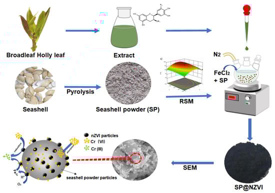 Proposed scheme for green synthesis of SP@nZVI and the related mechanism controlling its reaction with Cr(VI).