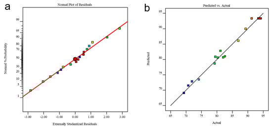(a) The normal plot of residuals for Cr(VI) removal. (b) Plot of the actual and predicted response. The colors of points have no specific meanings.