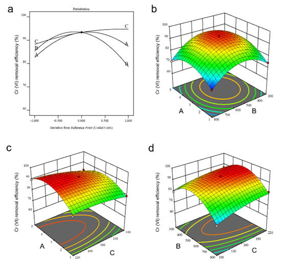 Surface for the effect of different variables on Cr(VI) removal. (a) The independent impact of three variables A, B, and C on Cr(VI) removal. A, B, and C indicate the mass ratio of SP/nZVI, the pyrolysis temperature, and the powder mesh of SP, respectively. (b–d) The impact of combinations of every two of the three variables on Cr(VI) removal: A and B (b), A and C (c), B and C (d).