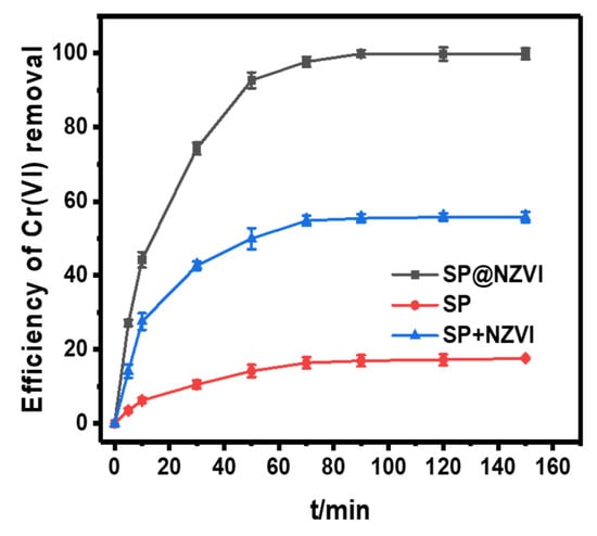 We evaluated the performance of SP@nZVI prepared under the optimal synthetic conditions in removing Cr(VI) from water: at T = 25 °C and pH = 5.0, 100 mL Cr(VI) solutions (30 mg L−1) were treated with SP, SP + nZVI (physically mixed SP and nZVI with identical mass ratio of SP/nZVI to SP@nZVI), and SP@nZVI, and the efficiency of Cr(VI) removal was continuously monitored in 150 min (Figure 6). For the three tested materials, the efficiency of Cr(VI) removal at equilibrium was 17.95% (SP), 55.75% (SP + nZVI), and 99.85% (SP@nZVI), respectively, suggesting the synergistic enhancement of Cr(VI) removal capacity in the SP@nZVI composite. At pH 2–6, both Cr2O72− and HCrO4− existed in the solution, and CrO42− became dominant when pH > 6. The higher Cr(VI) removal efficiency of SP@nZVI than that of SP + nZVI was possibly due to (i) the increased dispersity of nZVI on the SP support, and (ii) the shortened path of mass transfer at the SP/nZVI interface after they formed composites. The maximum capacity of Cr(VI) adsorption on SP and SP@nZVI was determined to be 5.39 mg g−1 and 29.96 mg g−1, respectively, which appeared higher than reported values using biochar and magnetic biochar adsorbents (Table 4).