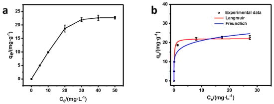 To further investigate the Cr(VI) removal process, we monitored the adsorption isotherms of SP@nZVI by varying the initial concentration of Cr(VI). Figure 7a depicted the relationship between the initial concentration of Cr(VI) (C0, mg L−1) and the adsorption amount of Cr(VI) at equilibrium by SP@nZVI (qe, mg g−1). The results showed that qe linearly increased as C0 increased from 5 to 30 mg L−1. However, as C0 was higher than 30 mg L−1, qe gradually reached an equilibrium maximum at 23.66 mg g−1, indicating that the active sites on the SP@nZVI composite tended to be saturated by C0 larger than 30 mg L−1. Based on Figure 7a, we fitted the experimental data with both Langmuir and Freundlich adsorption isotherms. The Langmuir model is presented as Equation (4).