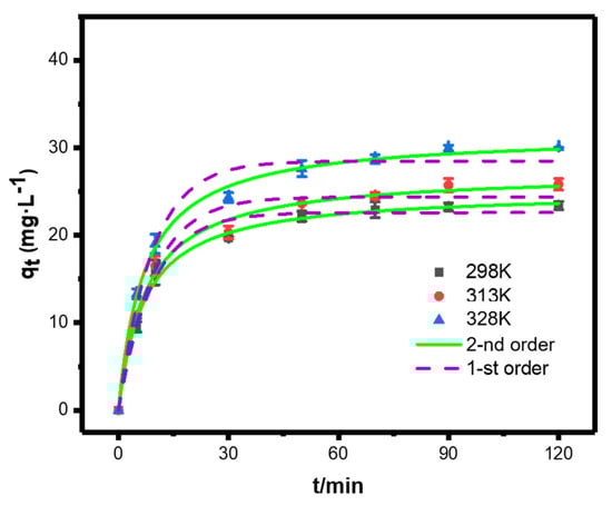 We next studied the adsorption kinetics of SP@nZVI-mediated Cr(VI) removal. As shown in Figure 8, the adsorption amount of Cr(VI) at equilibrium (qe, mg g−1) increased from 20.41 to 29.95 mg g−1 as the temperature increased from 298 to 328 K. The experimental results were examined using kinetic models of pseudo first-order (PFO) and pseudo second-order (PSO) to help understand the mechanisms of Cr(VI) removal. The non-linear forms of PSO and PFO models were presented as Equations (6) and (7), respectively.