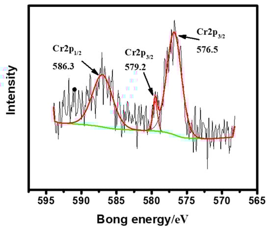 There have been frequent incidents of water pollution caused by harmful heavy metal ions around the world. In China, nearly 20% of water resources are contaminated by heavy metals such as chromium []. Cr(VI) is highly toxic and easily transferrable to humans through the food chain, which poses serious health risks to the environment. The treatment of Cr(VI) in the water is urgently required. Materials and methods for efficient Cr(VI) decontamination are highly requested []. Currently, methods for removing Cr(VI) from polluted water include ion exchange, membrane separation, chemical reduction, adsorption, and so forth []. Among them, adsorption is widely applied due to its easy operation and low cost []. However, the removal efficiency of surface adsorption still remains to be elevated. Besides, adsorption fails to convert Cr(VI) into its precipitable form, which is easier to be separated than the ionic form. Therefore, combining adsorption and other strategies may render improved performance of Cr(VI) decontamination.