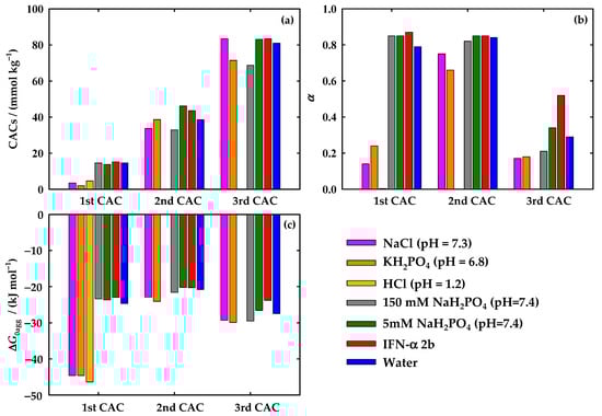 (a) Critical aggregation concentrations (CACs), (b) ionization degree (α), and (c) Gibbs free energy of aggregation () of [C2C1Im][C4F9SO3] at 25 °C in different conditions: 150 mM NaCl at pH 7.3 (pink); 25 mM KH2PO4 at pH 6.8 (orange); 100 mM HCl at pH 1.2 (yellow); 150 mM of NaH2PO4 at pH 7.4 (grey); 5 mM of NaH2PO4 pH 7.4 (green); 10 μg/mL mM of IFN-α 2b in 5 mM of NaH2PO4 at pH 7.4 (red); and water (blue) [] for comparison purposes.