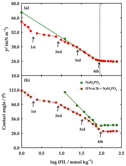 For further investigation on the influence of the IFN-α 2b in the aggregation behaviour of FILs, the surface properties of [C2C1Im][C4F9SO3] were determined through two methods: (i) measurement of the surface tension and (ii) determination of the contact angles. The surface tension allows for the evaluation of the surface activity of the FIL in aqueous solutions. The common behaviour of the surface activity on SAILs is ruled by the adsorption at the air/water interface which reduces the interface energy between both phases []. Therefore, the surface tension decreases upon the addition of FIL up to a point where the accumulation of molecules at the interface is completed []. This breakpoint is known as the CMC, representing the formation of aggregates. Above the CMC, the value of the surface tension is kept constant due to the formation of more aggregates without surface activity. For the case of [C2C1Im][C4F9SO3], this behaviour was previously found in water, where only one transition, on the surface tension versus FIL concentration, was found. In these systems, the perfluoroalkyl chain points towards the inside of the aggregates, keeping the polar functional groups interacting with water [].