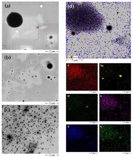 Moreover, the samples were subject to EDS analysis which allowed the elemental analysis of the aggregates, providing images of the distribution of each element present in the aggregate. The IFN-α 2b is constituted by carbon, hydrogen, nitrogen, oxygen, and sulphur, the buffer elements are explicit in its nomenclature, NaH2PO4, and the FIL is composed of carbon, hydrogen, nitrogen, sulphur, and fluorine elements. The EDS analysis of IFN-α 2b can be found in Figure S4 of Supplementary Materials and the elements, sodium, oxygen and phosphorus, were identified in this solution. The EDS images lead to the conclusion that these elements, predominant in the buffer structure, are in the darker zones that correspond to the IFN-α 2b aggregates. Then, IFN-α 2b aggregates in a self-assembled structure where an accumulation of the elements of the buffer is identified. There is also the presence of several smaller circles where the buffer elements are concentrated that may be the molecules of protein that do not aggregate or are in a different conformation. Figure S5 of Supplementary Materials shows the same analysis for the [C2C1Im][C4F9SO3] solution. In this case, as expected, the sulphur and fluorine elements of the anion are identified in the areas where the dark circles of FILs aggregates were found. Moreover, the elements of buffer, such as sodium and oxygen (from FIL and buffer), are more concentrated in the FIL aggregates, leading to the conclusion of a strong effect of the buffer in the FILs aggregates. The EDS analysis of the mixture [C2C1Im][C4F9SO3] with IFN-α 2b is illustrated in Figure 3d and the results show that the irregular dark circles have a composition similar to both protein and FIL, with a diffusion of the elements of the buffer and the FIL in the dark spots. In this case, it was also possible to obtain nitrogen analysis due to the higher population of this element in the solution (from the protein and FIL). This element is also concentrated in the area that corresponds to the aggregates found in the images. These results support a protein-FIL interaction due to the dispersion of the components of both species focused on the dark spots. Therefore, the dark circles correspond to an aggregate formed by the FIL and the protein, which allows the dispersion of the bigger aggregates formed by the isolated protein.