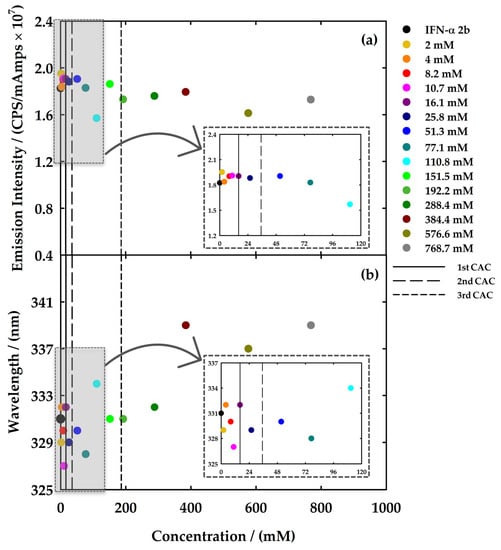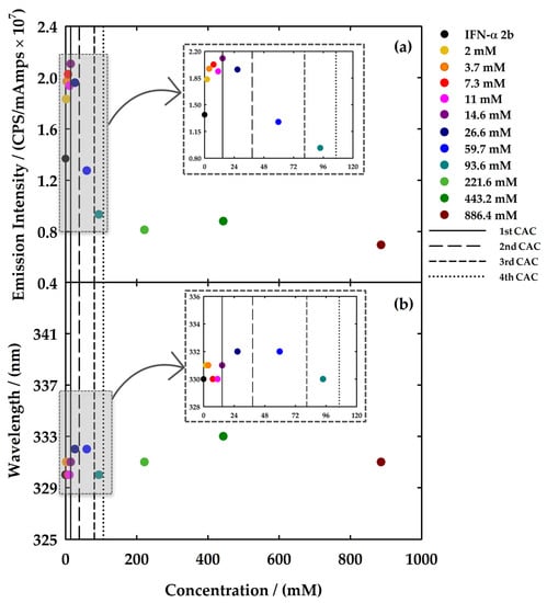 Figure 6 corresponds to the results related to the impact of the variation in the concentration of [C2C1Im][C4F9SO3] in the protein emission. In this plot, two main comportments are observed concerning the intensity of the emission: the presence of FIL in concentrations under the 1st CAC increases the emission intensity of the IFN-α 2b. After the 1st CAC, a decrease of that intensity to values lower than the spectrum of IFN-α 2b is observed when the FIL concentration is higher. Figure 6b shows that in the range of concentrations below the 1st CAC, the variations in λmax are between 0 to 1 nm (blue and red shift), and above the 1st CAC are found variations between 0 to 3 nm by a red shift. The results indicate that two different interactions are occurring within this system: (i) first, the FIL monomers interact with the protein and the fluorophores are more exposed to the solvent; and (ii) the aggregation of the FIL induces a quenching of the emission intensity, which might indicate that the interaction with the protein conceals the fluorophores from the solvent. The red shift of λmax does not appear significant, and this FIL does not show a destructive behaviour towards the protein in this range of concentrations.