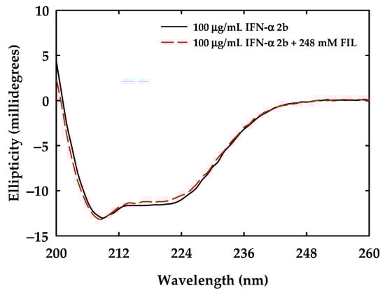 As a first approach, UV–Vis spectrophotometry was used to measure the absorption spectra of the IFN-α 2b. This method follows the behaviour of the chromophores composing the structure of the proteins, such as the amide group of the protein backbone and the aromatic amino acids such as tryptophan, tyrosine, and phenylalanine []. Therefore, these structural features act as spectral probes of significant perturbations occurring in the local environment of the protein through their exposure to the solvent []. Thus, the IFN-α 2b absorption spectrum is very similar to that of most proteins, with a characteristic band between 260 and 300 nm. Any alteration on the profile of this band may indicate a perturbation of the protein chromophores, and consequently, the existence of an interaction with a ligand []. For example, the coverage of the protein surface by the FIL can be reflected in the absorption spectra by the absence of the characteristic absorption band or reflected in the turbidity of the solution due to the presence of protein-FIL aggregates [].