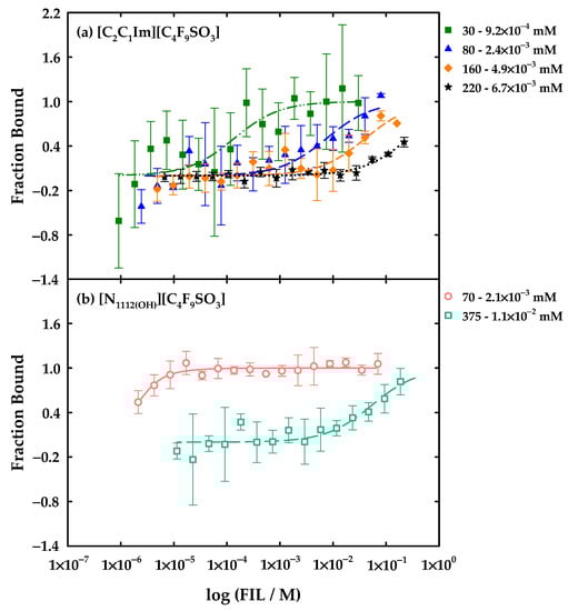 IFN-α 2b binding affinity with [C2C1Im][C4F9SO3] and [N1112(OH)][C4F9SO3] were determined by microscale thermophoresis (MST) using a Monolith NT.115 (BLUE/RED, NanoTemper Technologies, Munich, Germany). The IFN-α 2b was labelled fluorescently by a protein labelling kit, Alexa FluorTM 555 (A20174, Invitrogen, Thermofisher Scientific Inc., Waltham, MA, USA), according to instructions from the manufacturer. Several dilution series of 16 samples of 20 μL were prepared in triplicate for each studied system. All the solutions were prepared in the buffer of the protein, 5 mM of NaH2PO4 (pH = 7.4), and PCR tubes. In the first tube (1 out 16) 20 μL of FIL stock solution was added at twofold the maximum concentration defined for each assay. In the remaining 15 tubes, 10 μL of buffer was added, followed by the series dilution of the FIL. Therefore, 10 μL of labelled IFN-α 2b stock solution was added to each tube yielding a final protein concentration of 2.7 μM. For [C2C1Im][C4F9SO3], five maximum concentrations were selected (14, 30, 80, 160, 220 mM), while for [N1112(OH)][C4F9SO3], four maximum concentrations were chosen (15, 35, 70, 375 mM). The selected concentrations cover the range where the distinct CACs are formed in each FIL. The excitation power was determined by a pre-test and set to 20% whereas the MST power was set to medium (standard). The assays were executed in standard capillaries and triplicates. The results were processed using the MO.Affinity Analysis v2.3 software (NanoTemper Technologies, Munich, Germany).