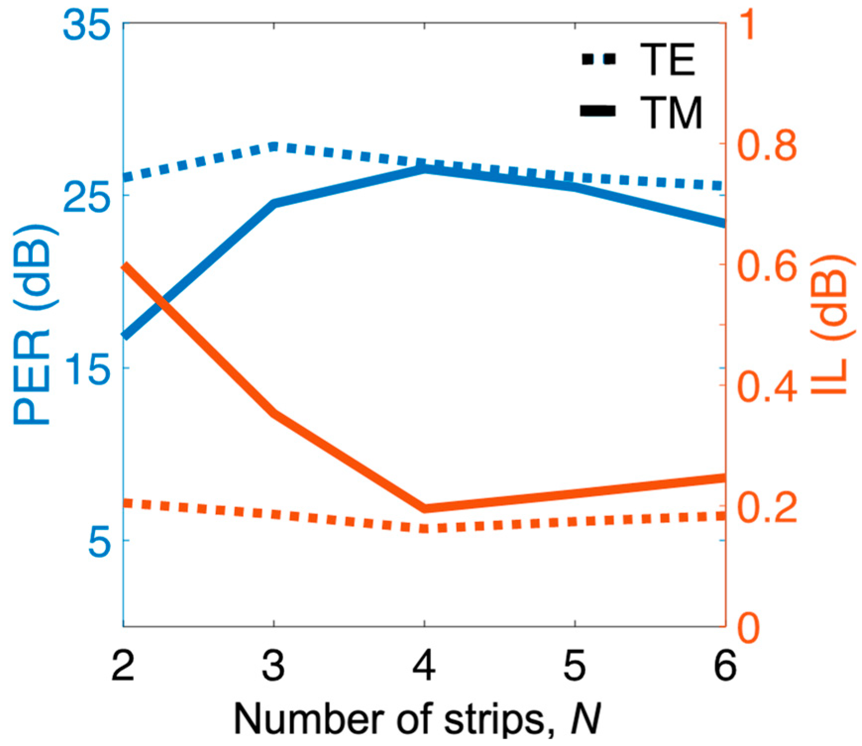 The ILs of the TE and TM modes slightly increased, ranging from ρz = 0.2 (LD = 2.9 μm) to 0.8 (LD = 2.55 μm), and PERTE and PERTM slightly varied as ρz varies. Differing from the major effect of ρx, ρz plays a finetuning role on device performance and length. Regarding to the number of Si strips (N), the PERs and ILs versus N (at the condition of ρx =0.6 and ρz = 0.6) are shown in Figure 7. The proposed PBS achieved optimal performance when N = 4 was chosen. Further increasing N resulted in moderately varying performance. The performance of TM mode dramatically worsened as N decreased. This result can be attributed to t Λx being increasingly away from the condition of Λx << λ, causing the increase in scattering loss that resulted from the grating structure [].